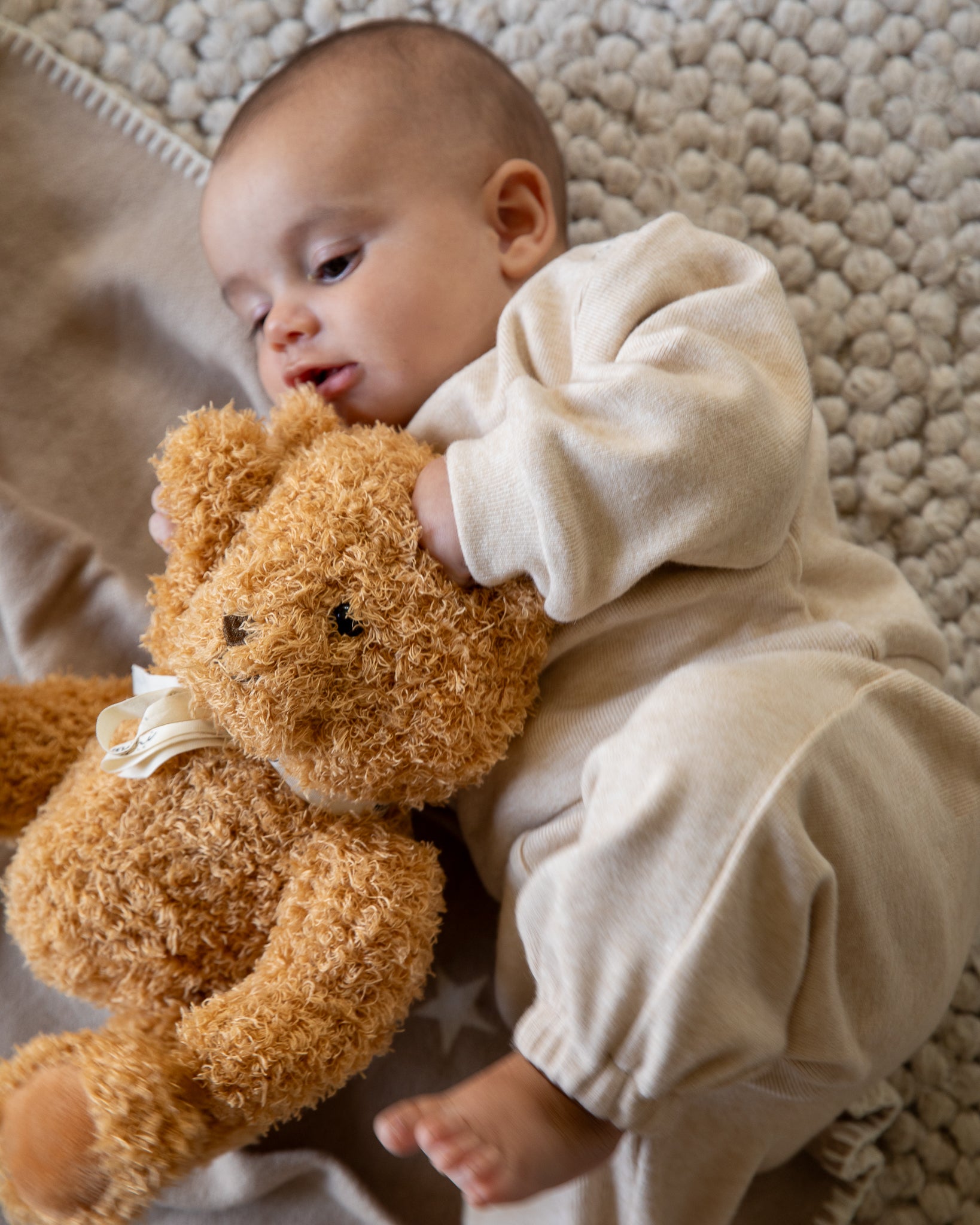 Chick is a super-soft baby tracksuit in a gentle cream tone, designed for comfort and play. The relaxed-fit sweatshirt features two popper buttons at the shoulder for easy changing, paired with cuffed bottoms for a snug fit. Cosy, practical, and perfect for everyday wear.
