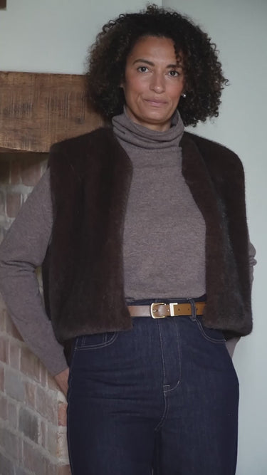Felicity Gilet is a super soft faux fur gilet featuring a satin tie front at the neck. A slightly neater fitting gilet perfect for layering.