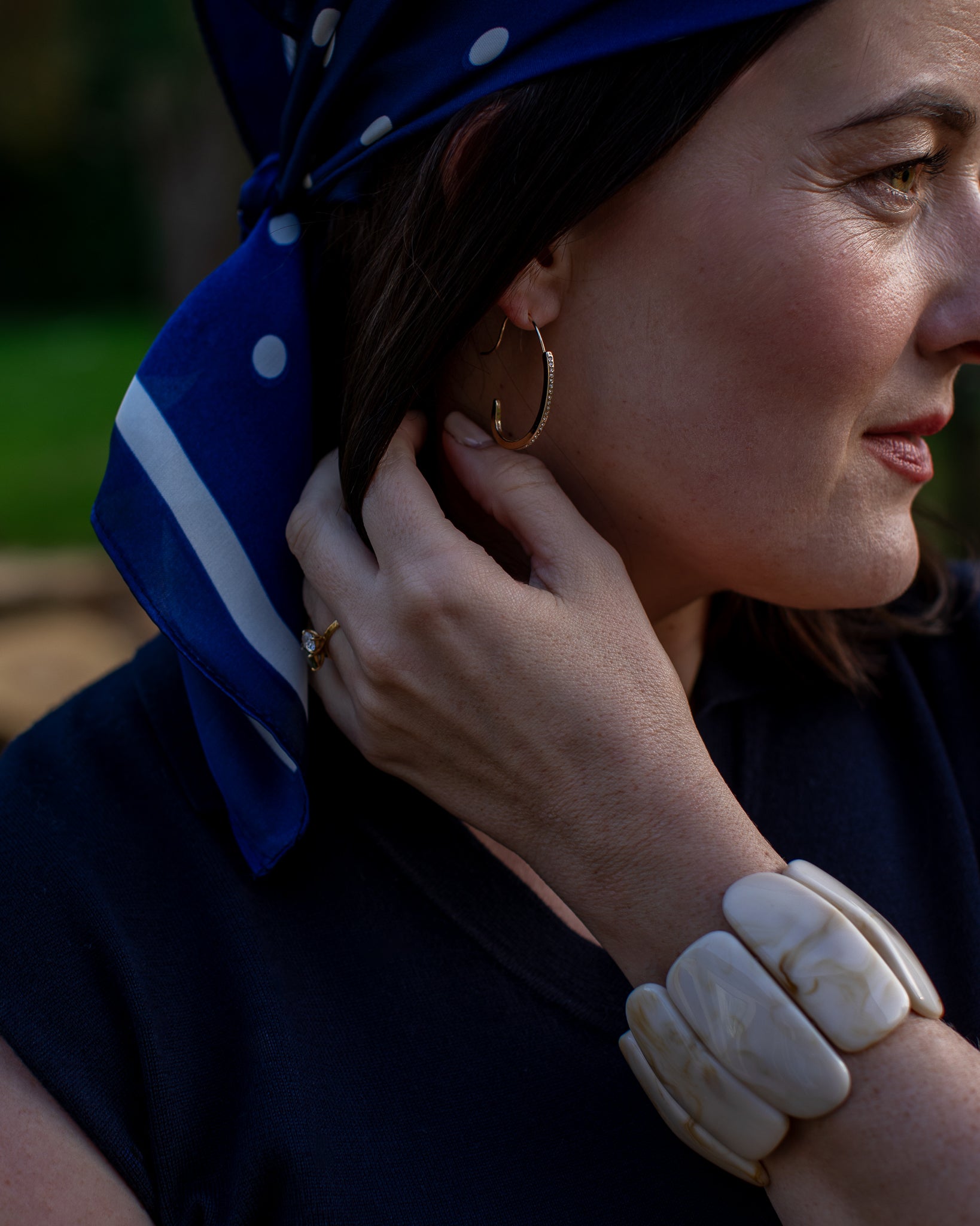 This cream marble bracelet is elasticated, its irregular shapes and mottled colour makes it a unique accessorise, wear on its own or stack with our other bangles for a layered look.
