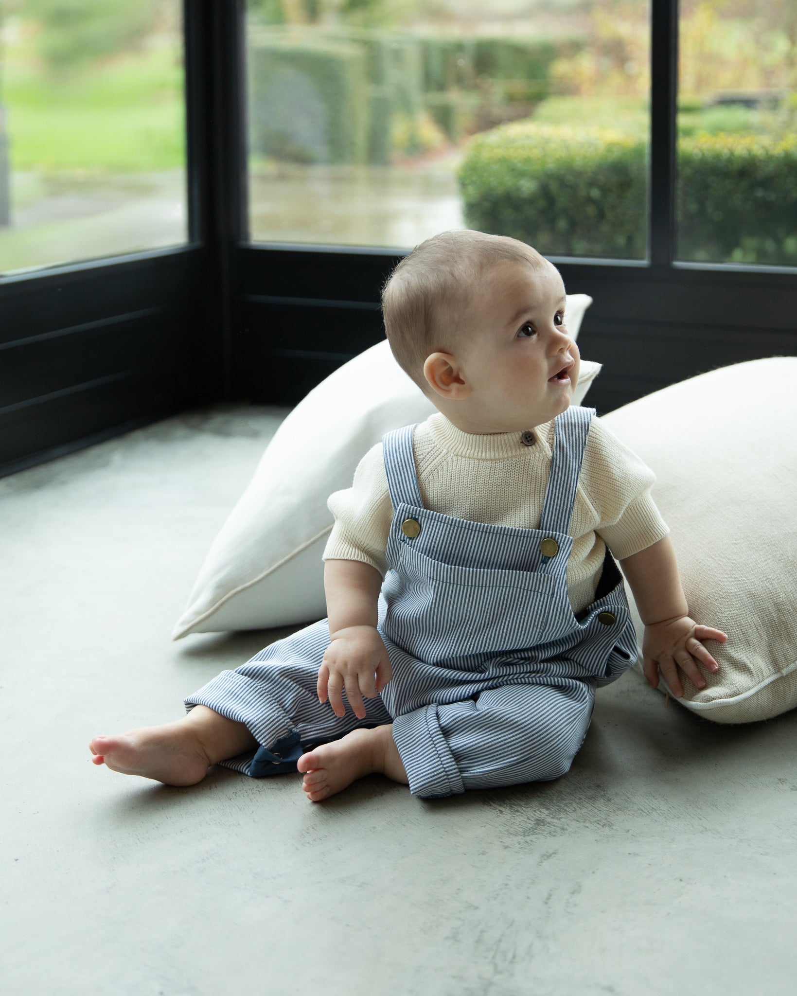 This dungaree-style jumpsuit is designed with a fine stripe and an easy, everyday fit. Featuring a large front pocket and adjustable straps finished with metal adjusters, it balances function with simple design details. Popper fastenings along the legs allow for easy changes, while turned-up hems add a relaxed finish. Two back pockets complete the piece.