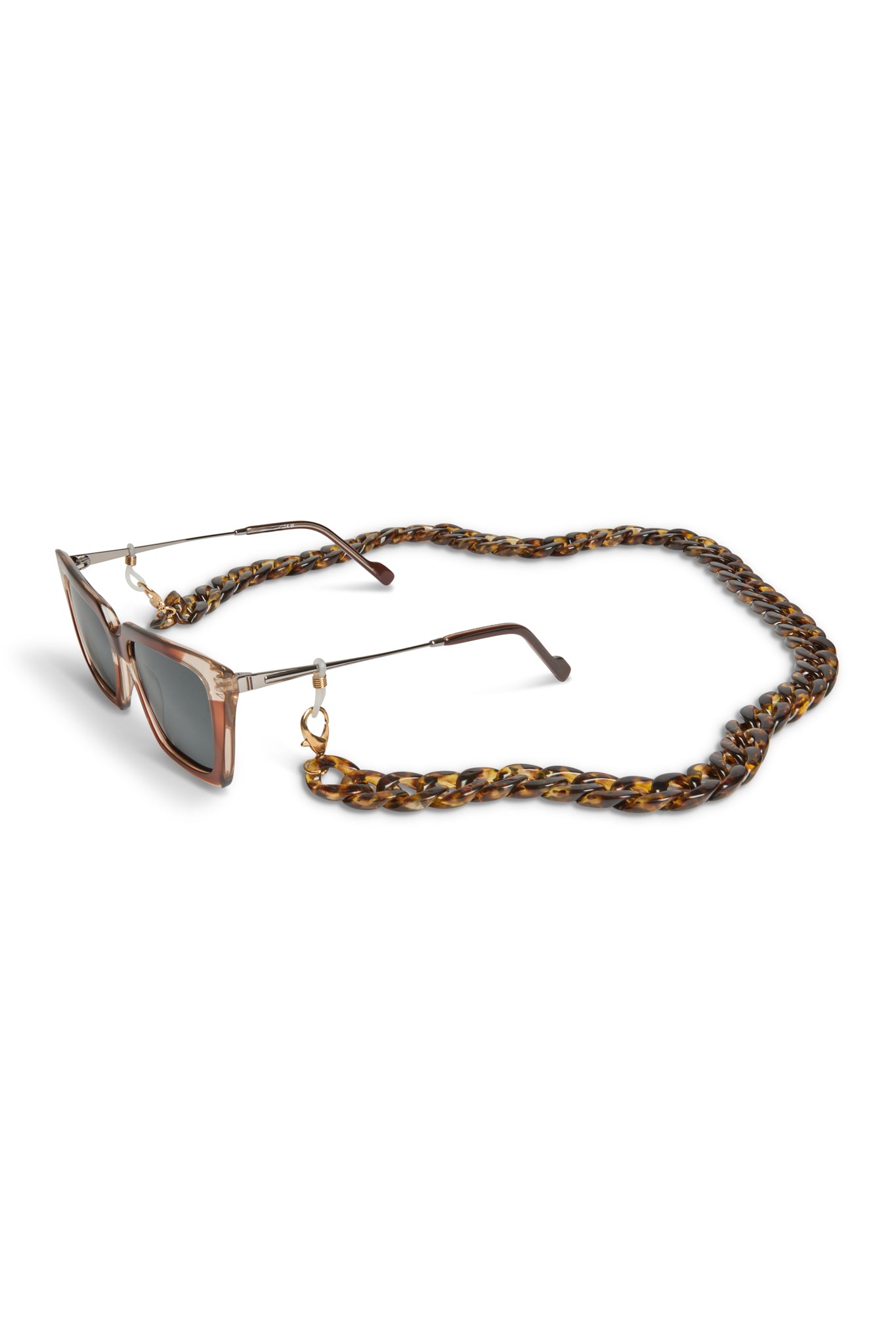 Chunky eyewear chain in large classic tortoiseshell acrylic. Finished with non slip rubber buckles to ensure a secure fit. Perfect for keeping your sunglasses or reading glasses within easy reach.