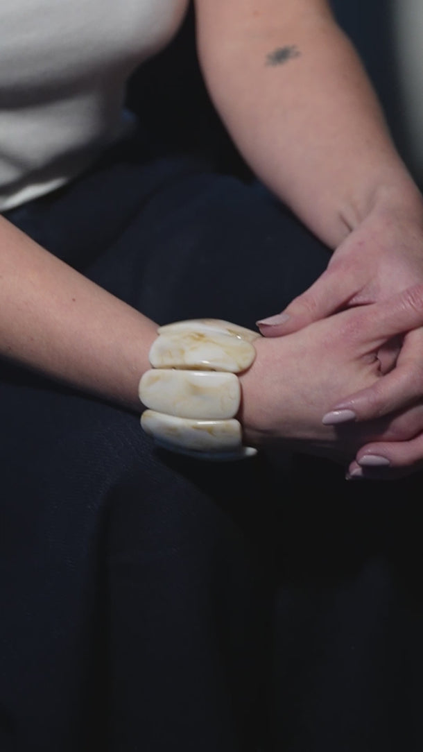 This cream marble bracelet is elasticated, its irregular shapes and mottled colour makes it a unique accessorise, wear on its own or stack with our other bangles for a layered look.
