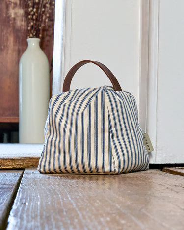 Dexter Doorstop has been made in a dense herringbone weave by Ian Mankin in traditional ticking stripe fabric comprising rich navy and warm white tones. This doorstop is filled with a mix of wonderfully fragrant Cotswolds lavender and wheat finished with a leather handle making it a functional and stylish solution to holding open your doors.