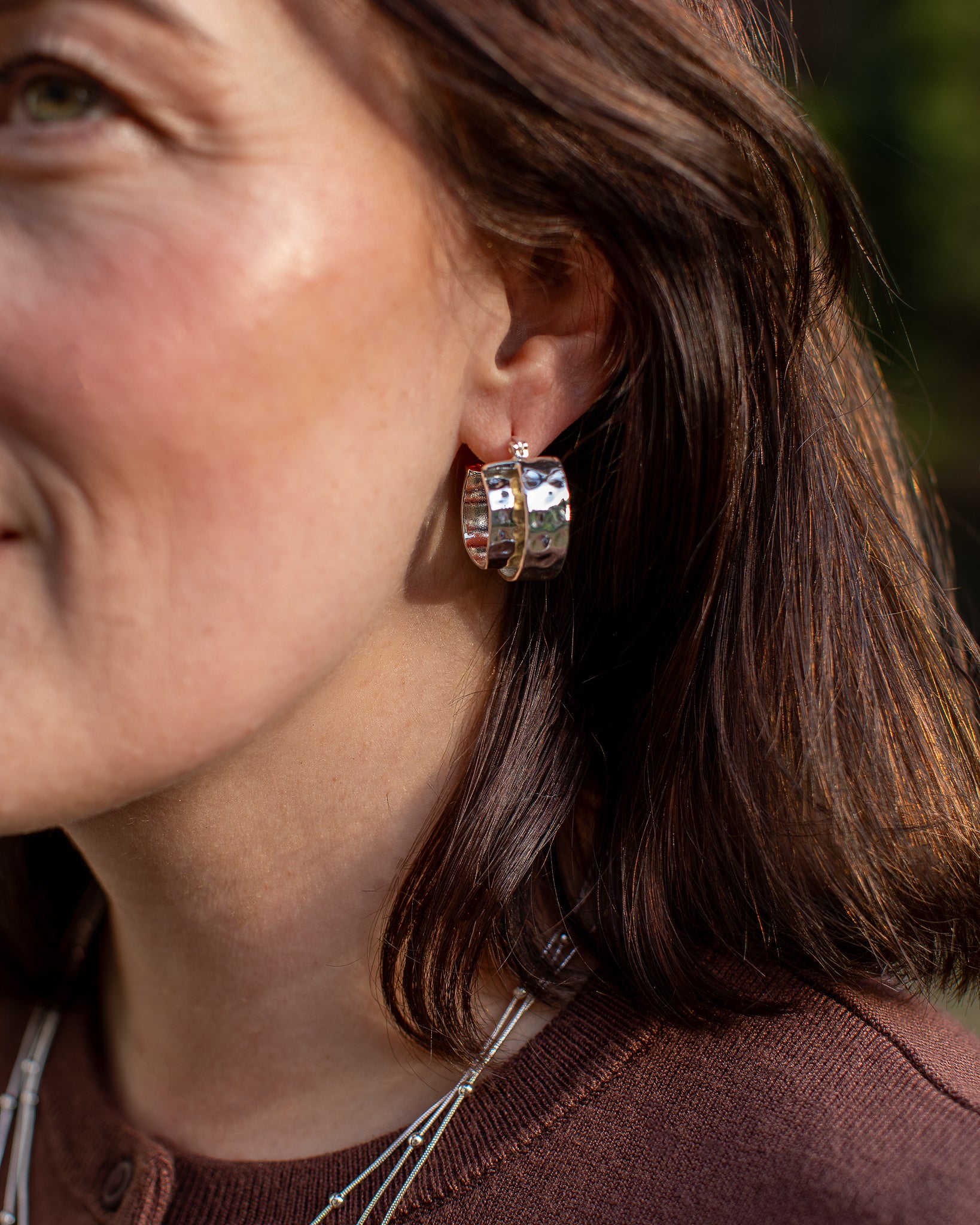 Satement double hoop earrings featuring a hammered finish for added texture and dimension. Bold yet refined, they’re designed to stand out without feeling overdone.