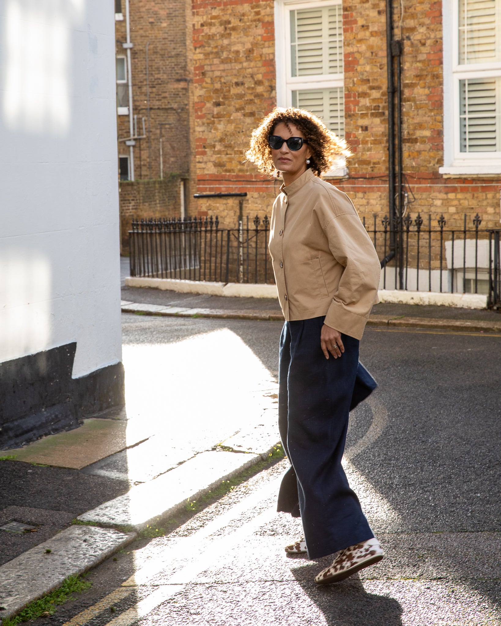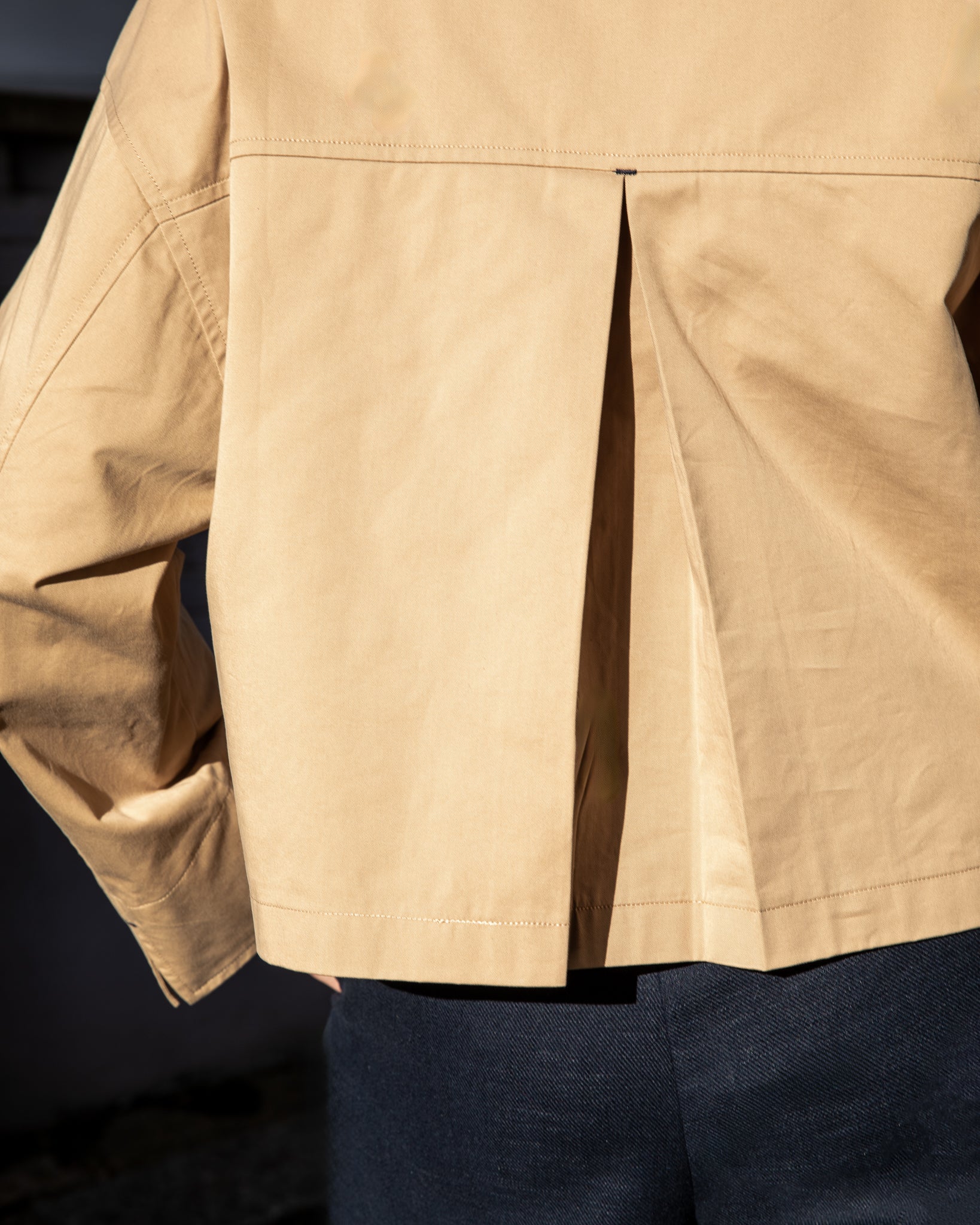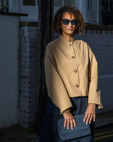 The Eddie Jacket is a cropped trench-style piece featuring an inverted pleat at the back for added swing and contrasting Navy tab details. It has cuff splits, a drop shoulder, and a short stand-up collar. Finished with tortoiseshell buttons, it combines classic elements with modern touches.