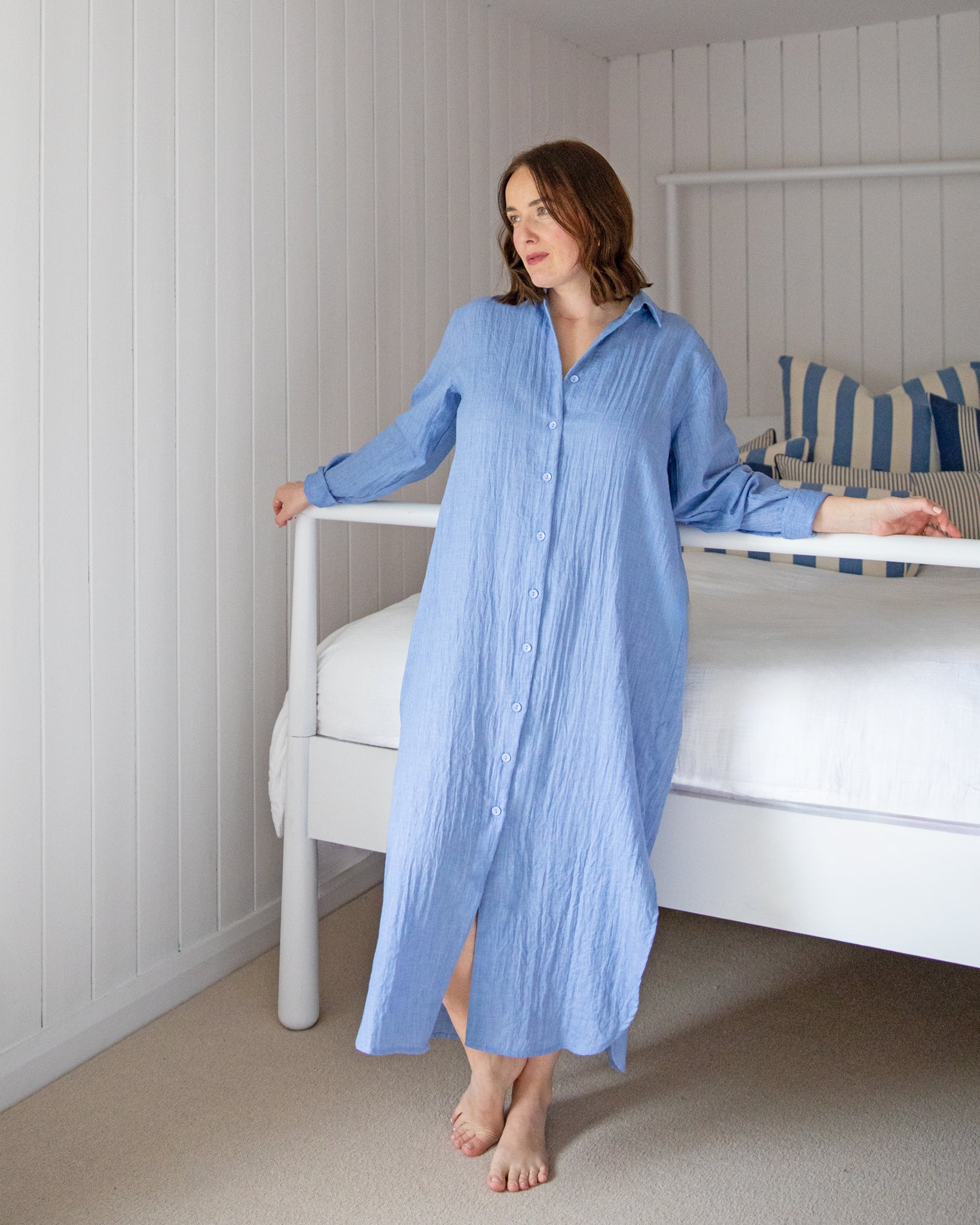 The Sarah Dress is a cotton/linen mix midi length dress with a relaxed yet elegant fit and has a classic collar with a subtle front slit for ease and visual interest. Finished with a small slit at the front and bottom of front hem to allow for movement and a flattering drape. Sarah has long sleeves with button cuffs.