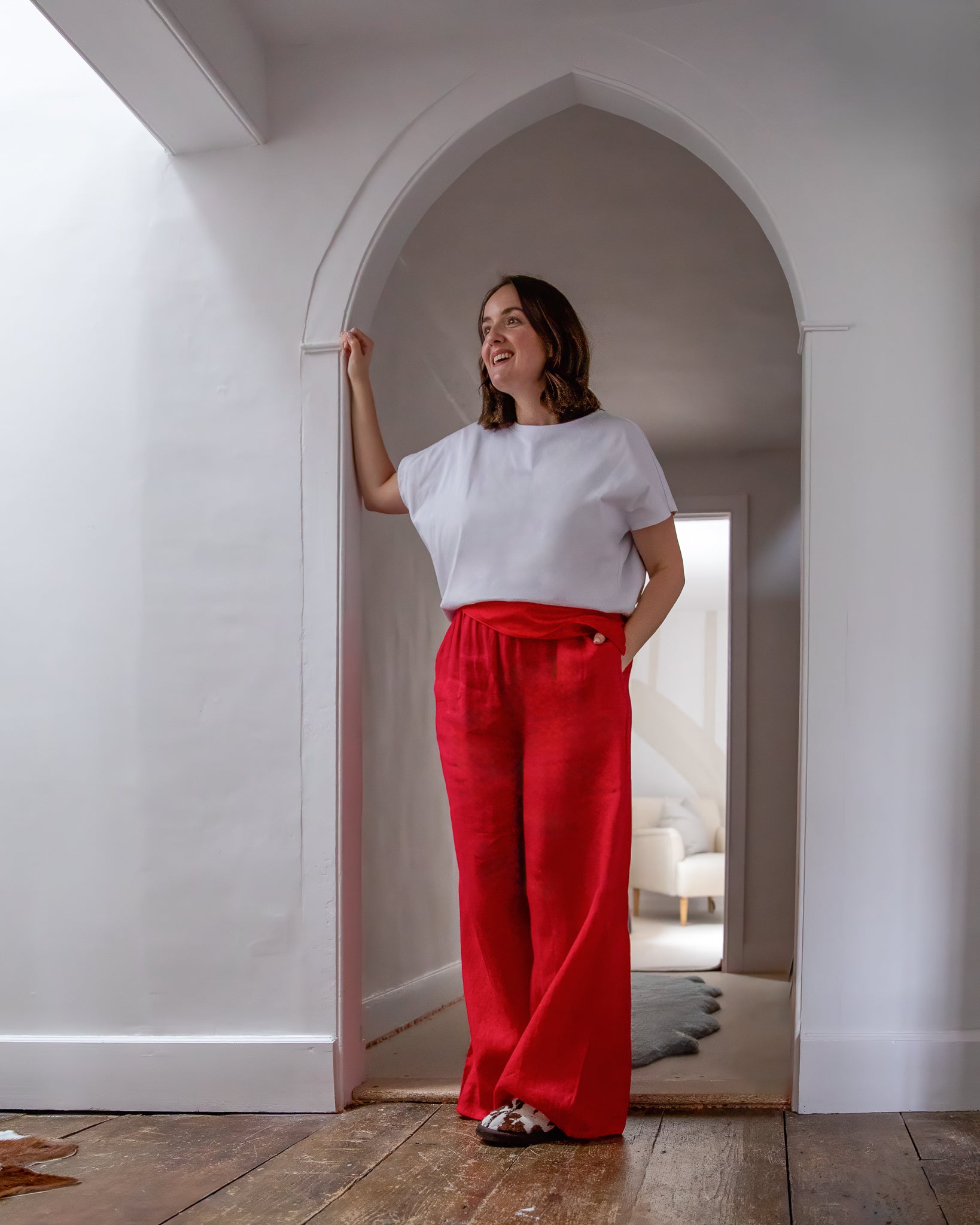 The Thea Pant is an 100% Linen wide length trouser with side pockets and an elasticated waist. Easily dress up or down.